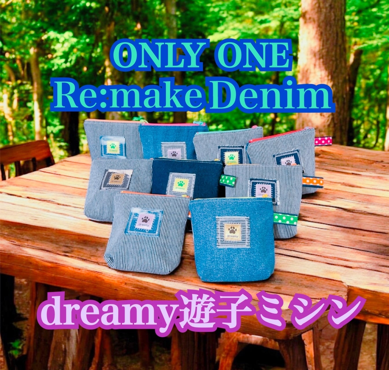 USEDデニム使用 たて 14cm よこ 15cm マチ 4cm 2026.1.11わんわんわんの日 全9犬種製作ONLYONEポーチ カラフルな肉球の足跡ペイント付き 裏面 お名前ペイントは喜んで承ります。*∅