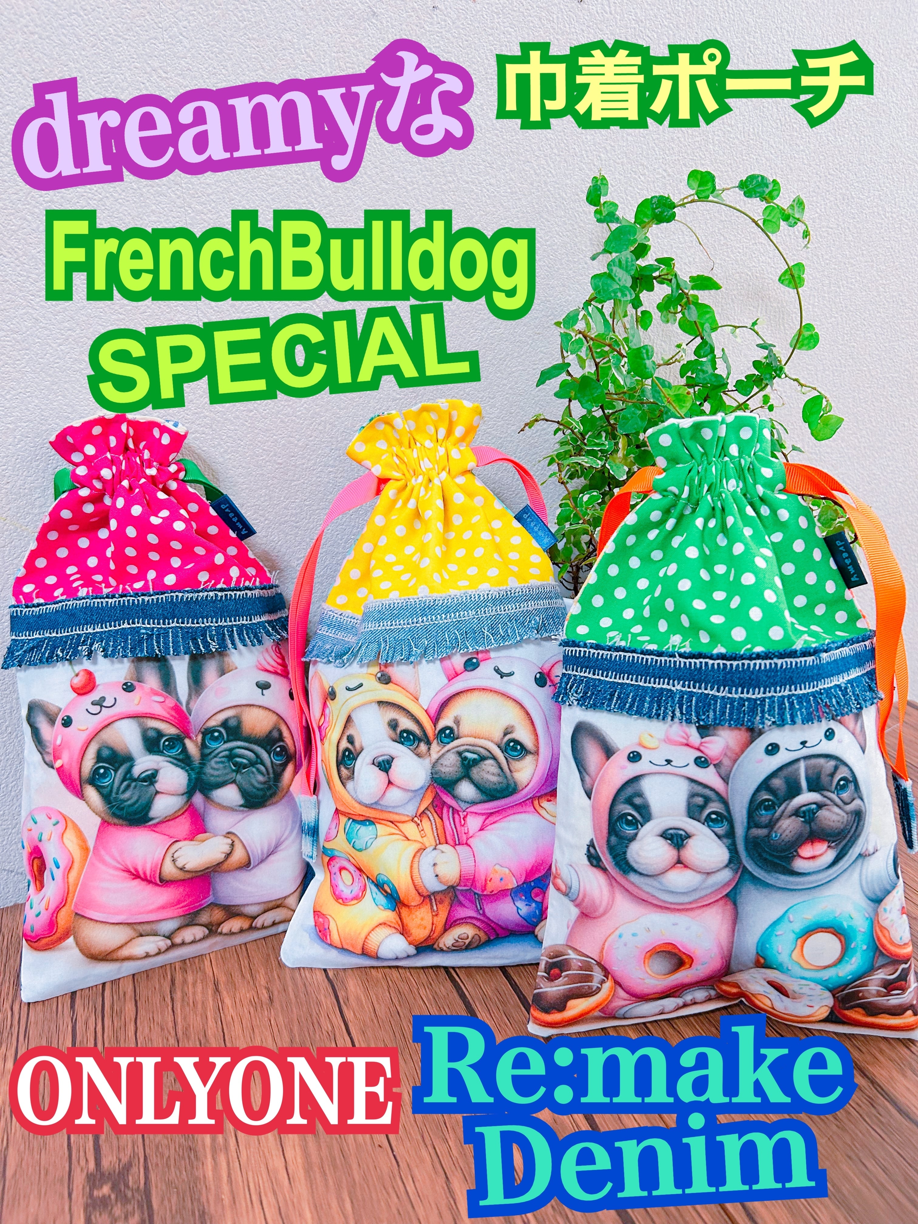 リメイクデニム巾着ポーチ★フレンチブルドッグフォーン★黄色