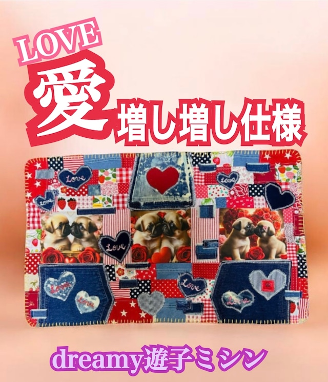 USEDデニム使用 パグの生地と可愛い赤のプリント生地 そして鮮やかなブルーのデニムの欠片を ワイルド&キュートにデザイン致しました。* バックのチャームにもお使いになれます♡ お好きな文字やお名前の ペイントをサービスいたしますので InstagramDMまたは BASEお問い合わせフォームにご連絡下さい。* また 今回はバレンタインスペシャルとして 送料はdreamyが負担いたします HappyValentine•*¨*•.¸¸♬︎