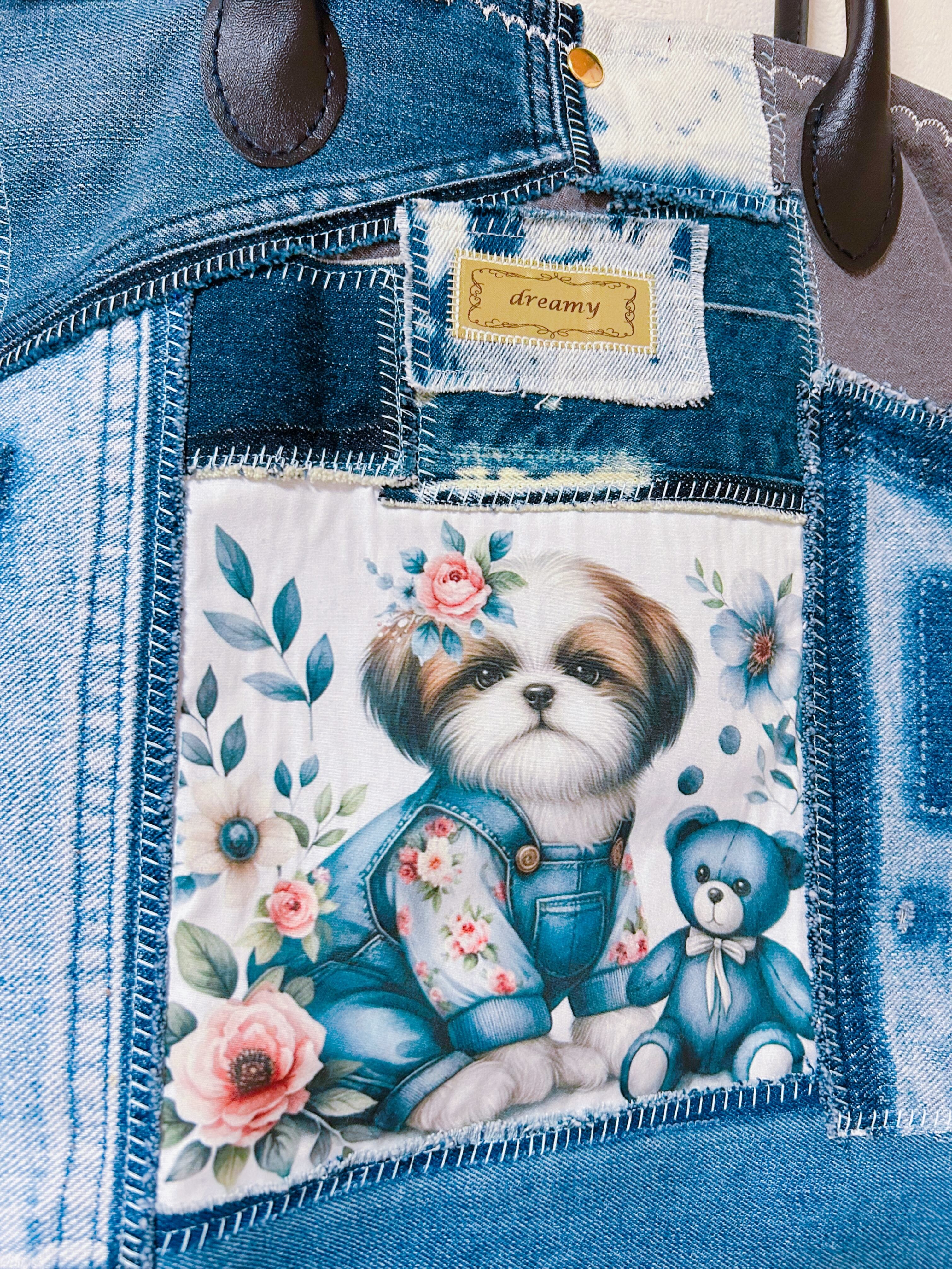 リメイクデニムBIGトートバッグ★ポーチ付き★オリジナルブリーチ★シーズーSPECIAL