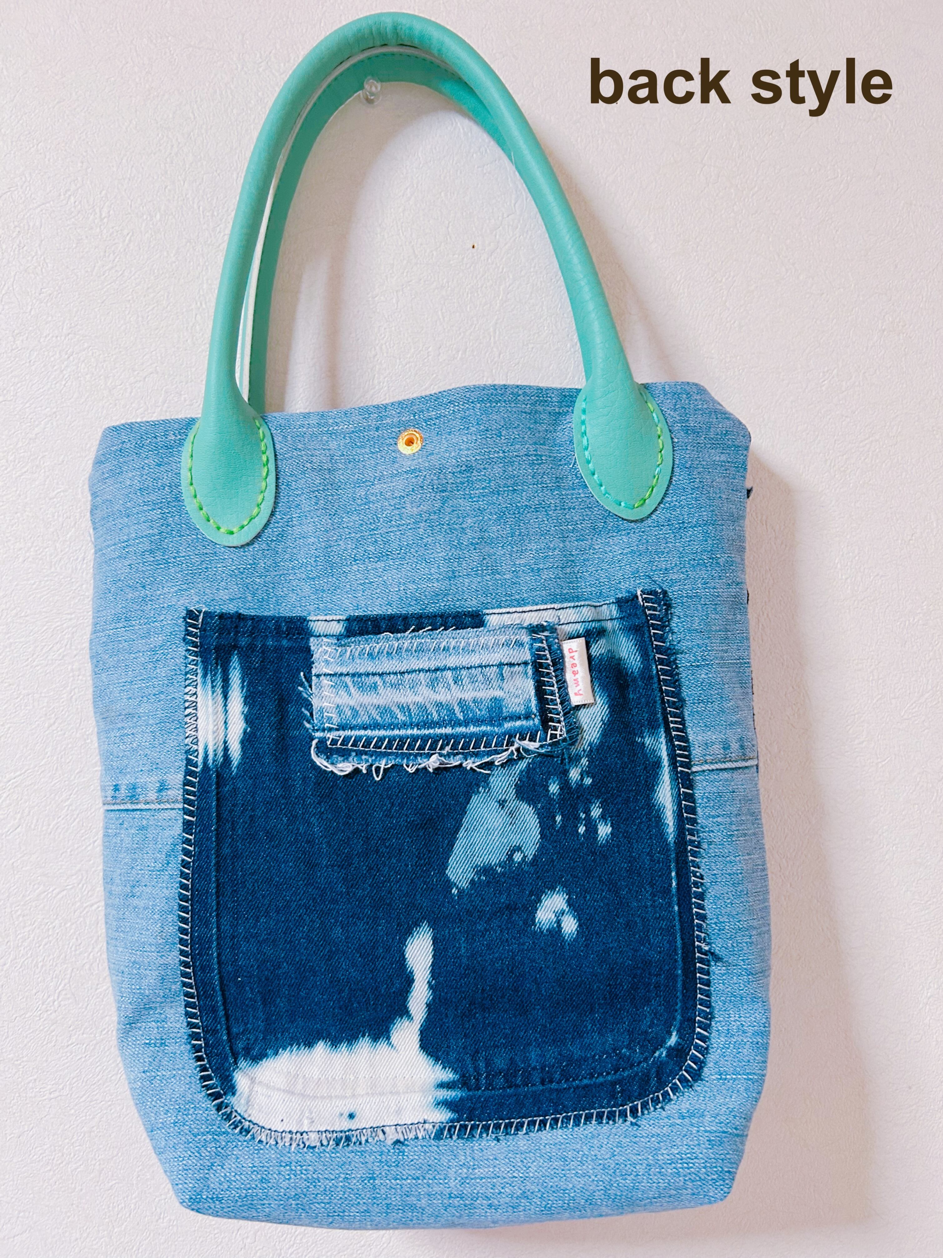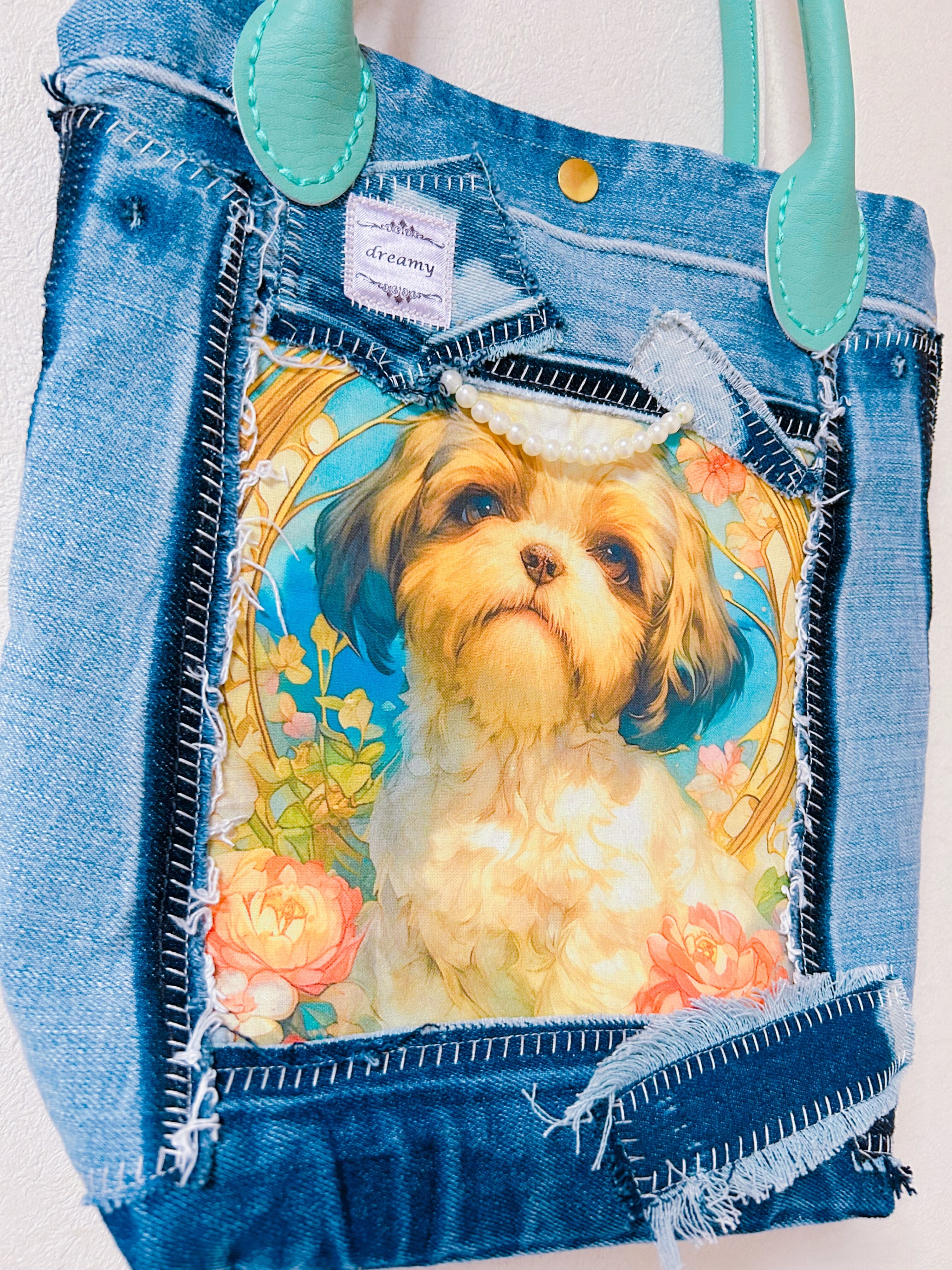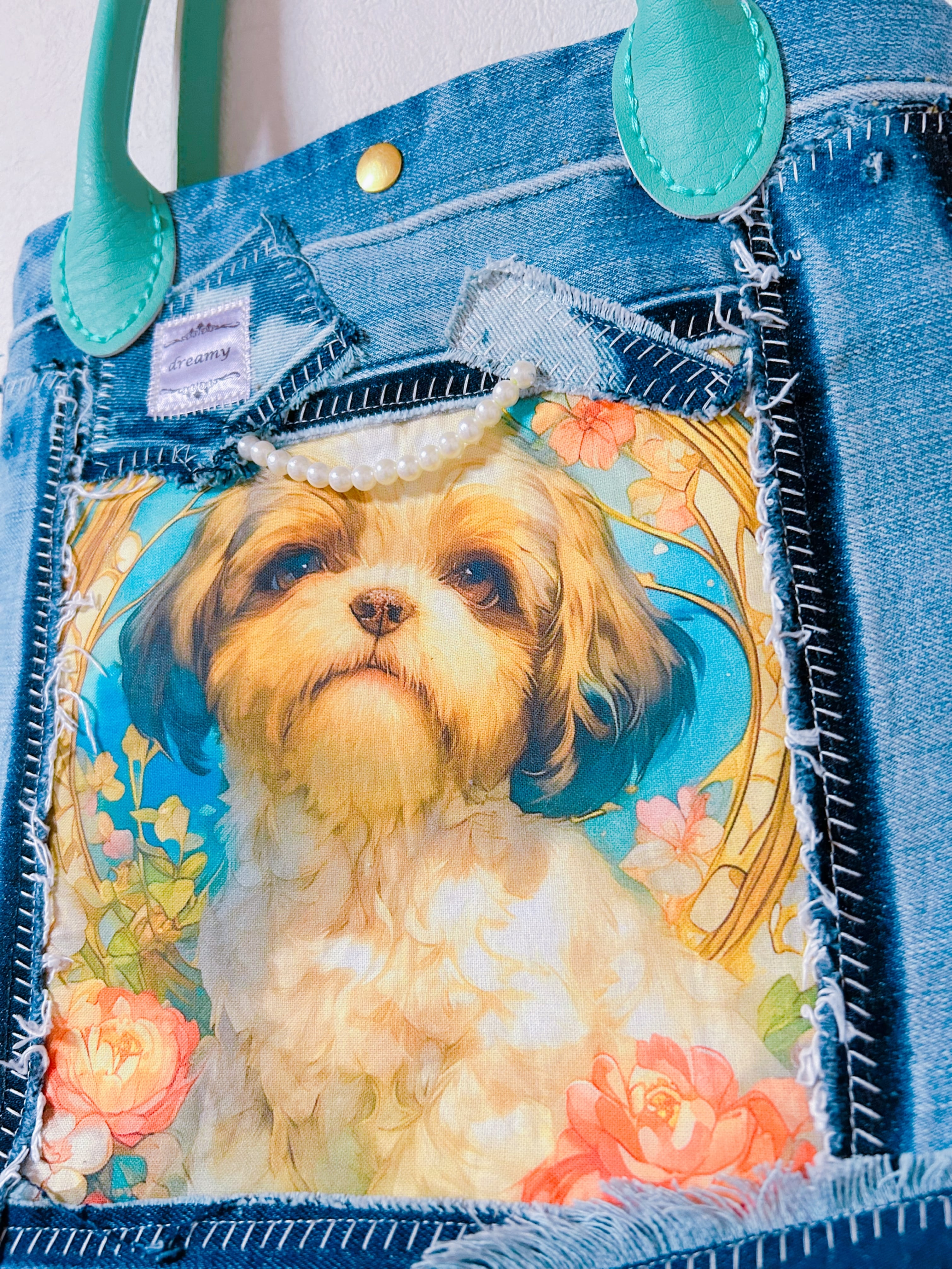 リメイクデニムトートバッグ★オリジナルブリーチ★シーズー★グリーンタイプ