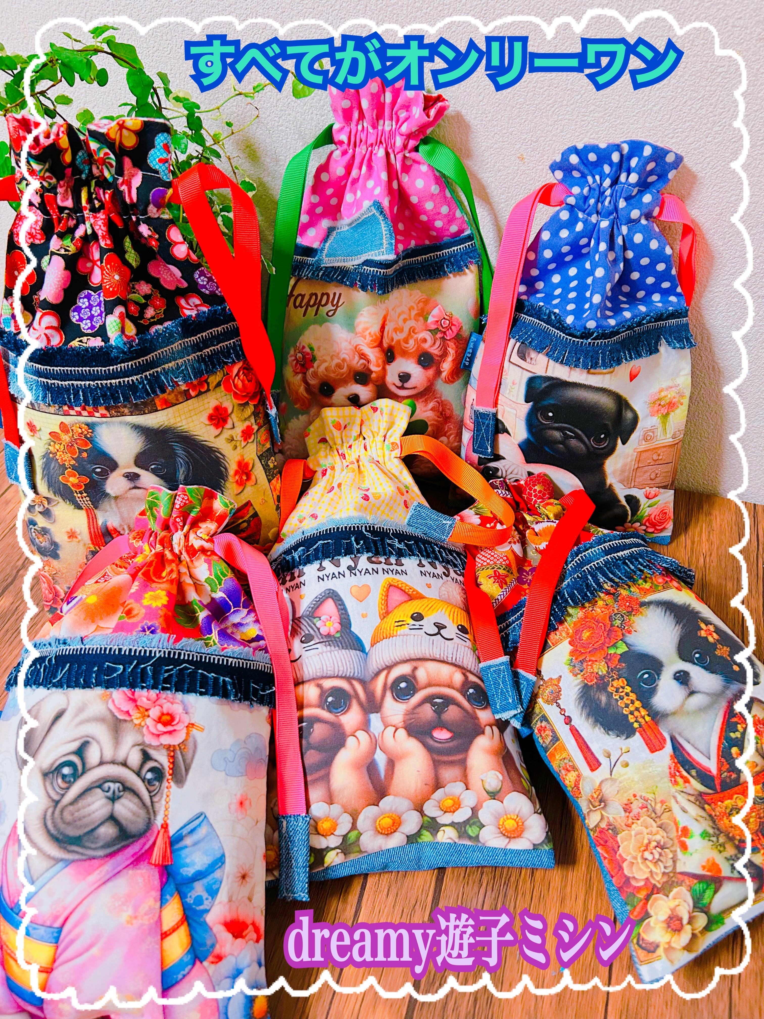 dreamyなリメイクデニム巾着袋★パグ和柄フォーン