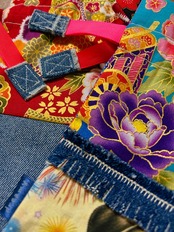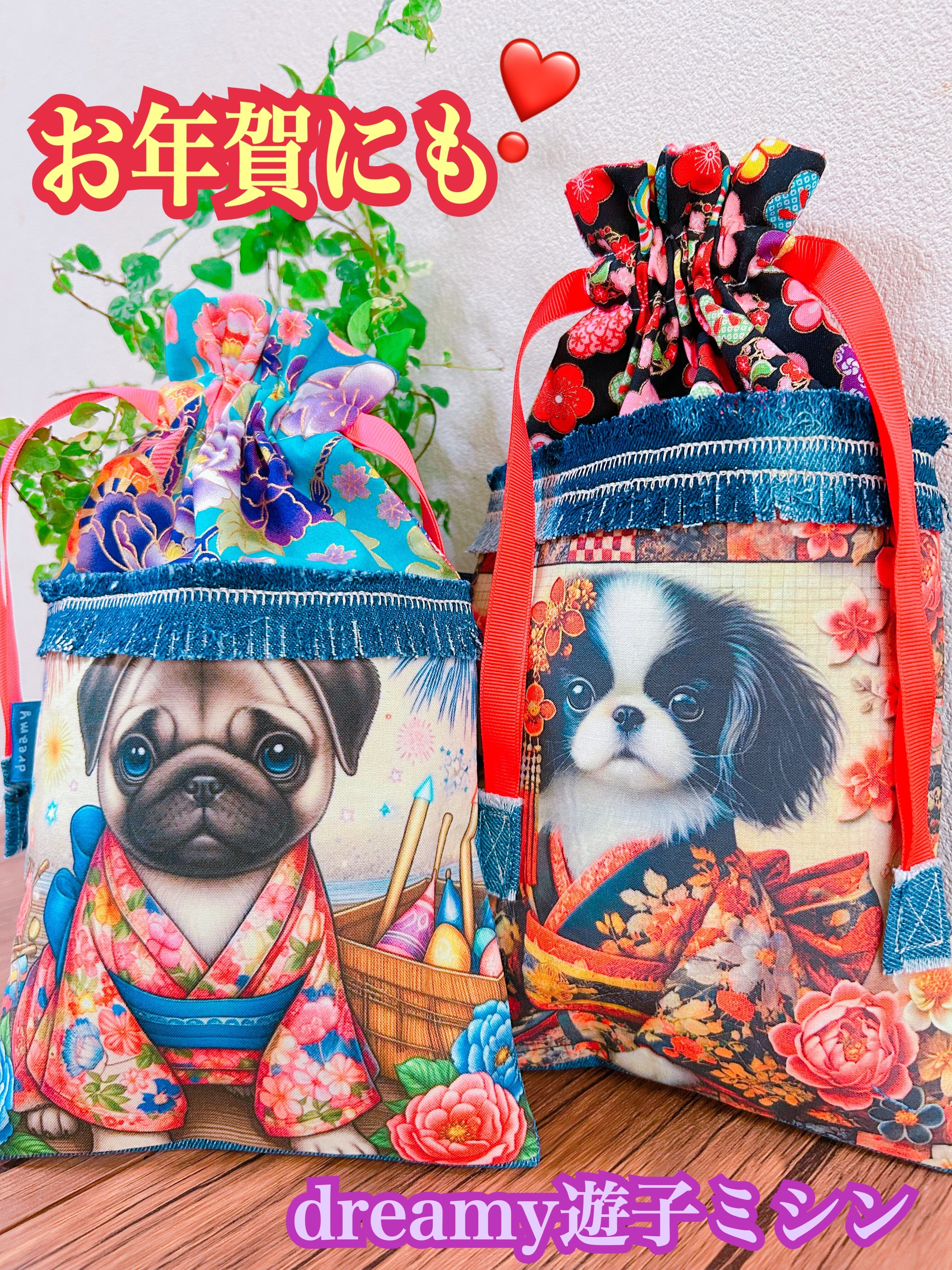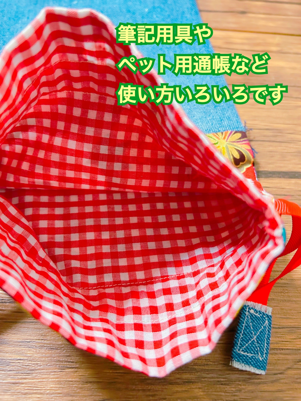 リメイクデニム巾着ポーチ★パグフォーン★和柄