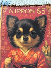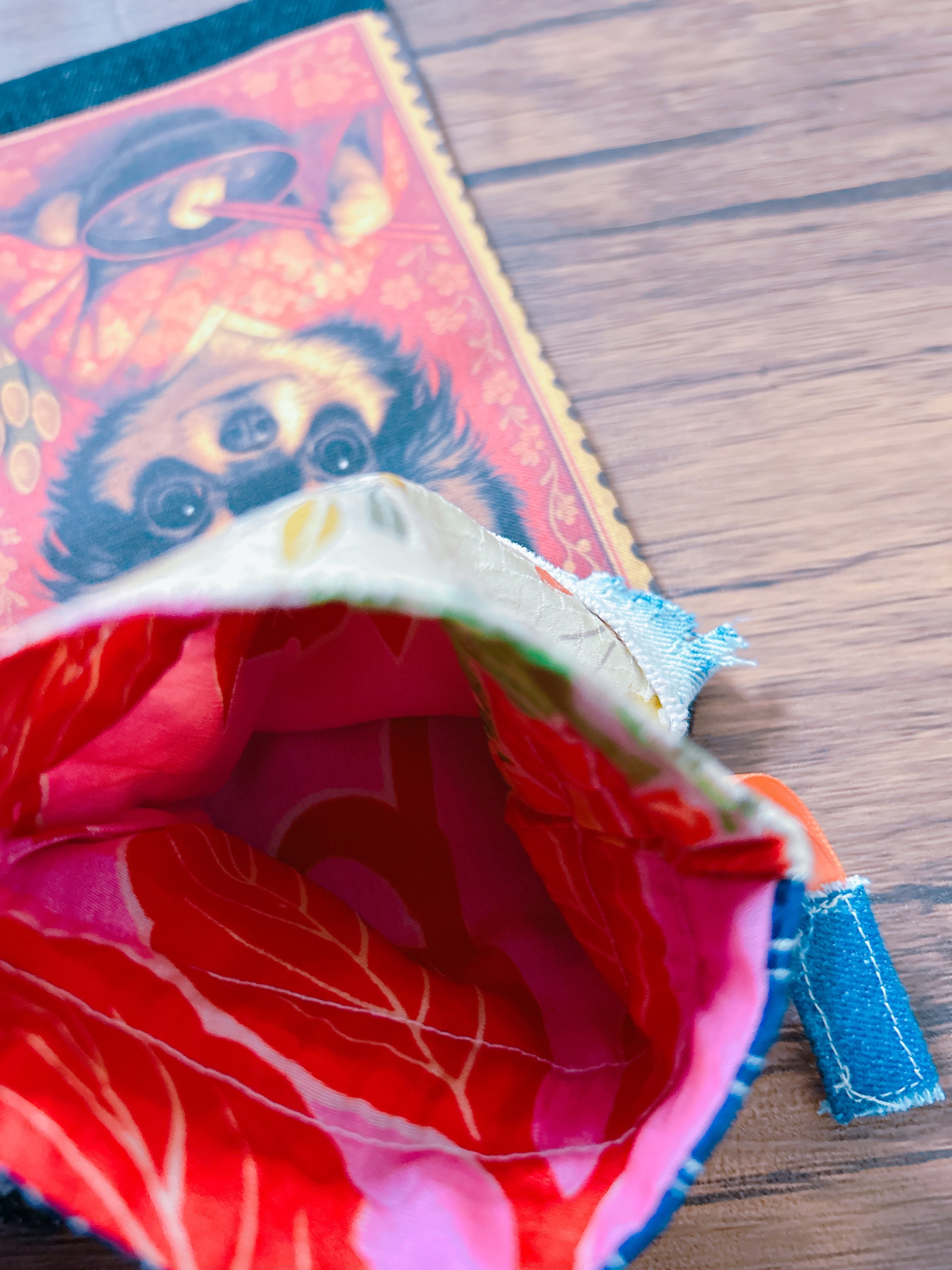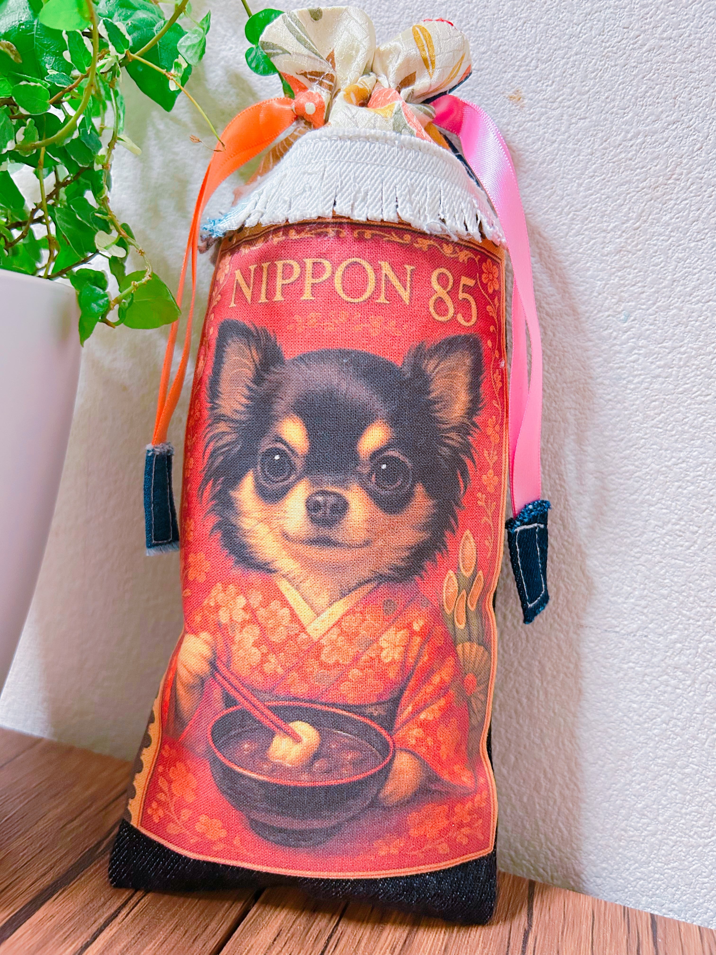 リメイクデニム巾着ポーチ★和柄Sサイズ★チワワ ブラックタン