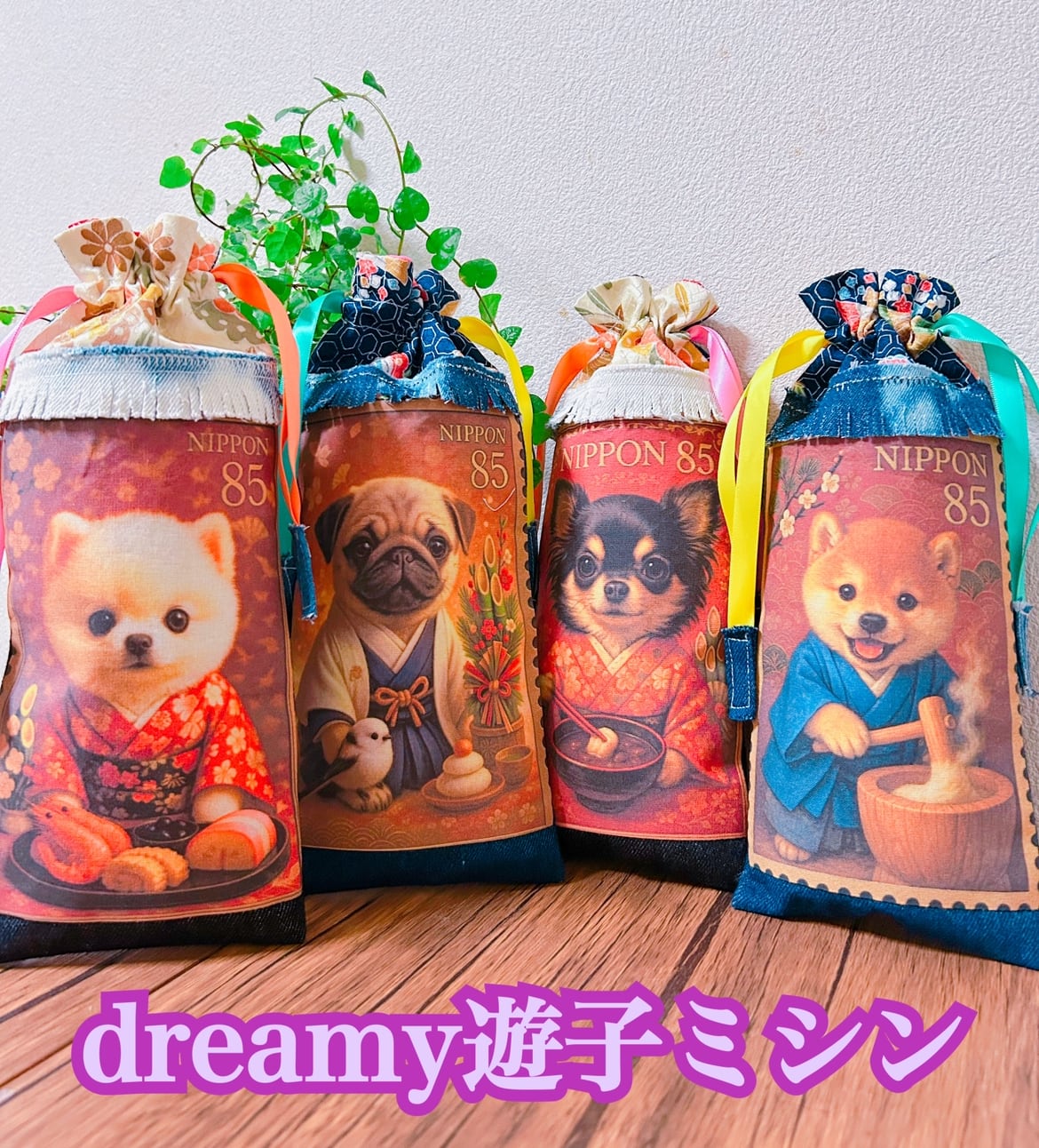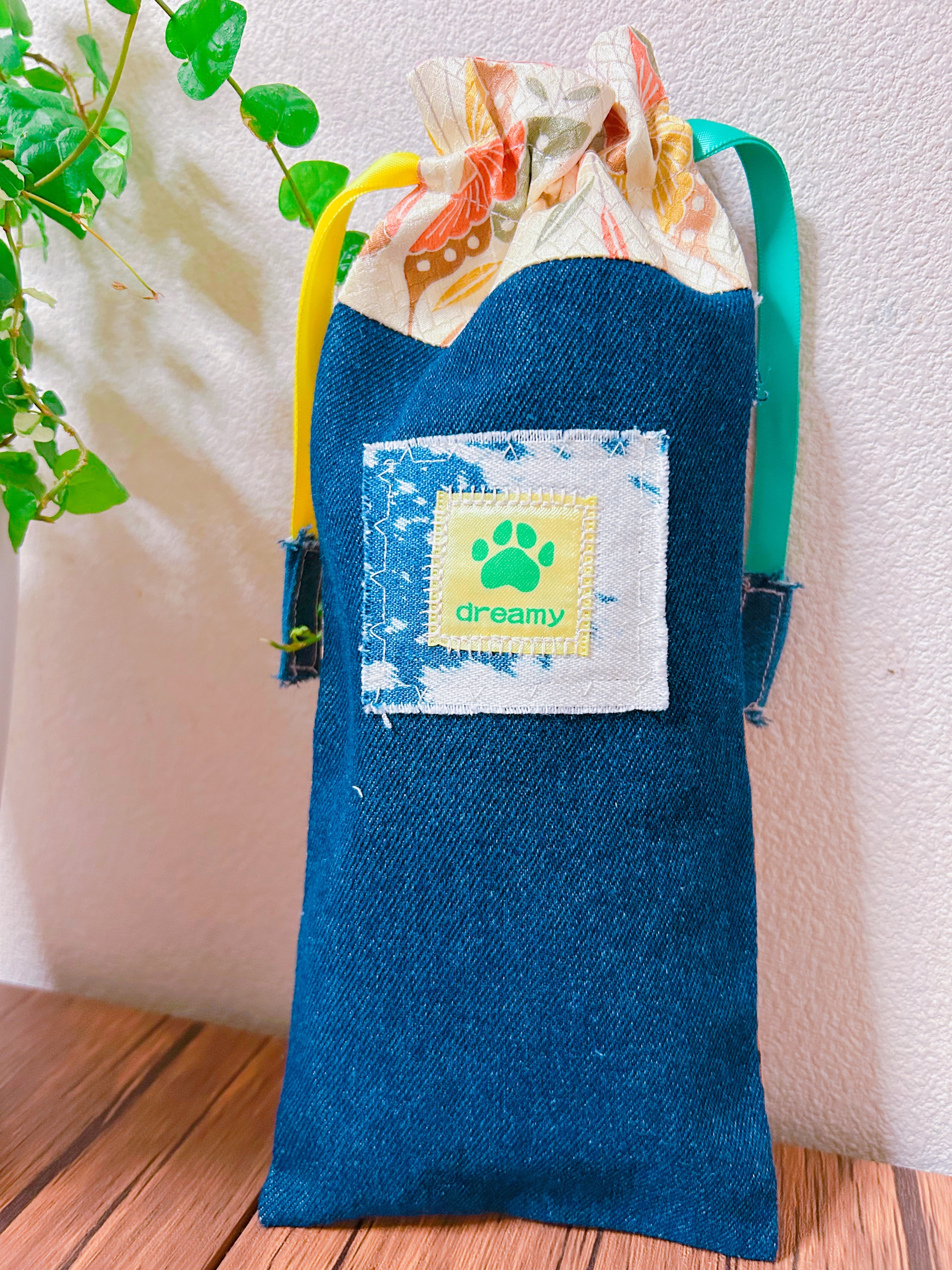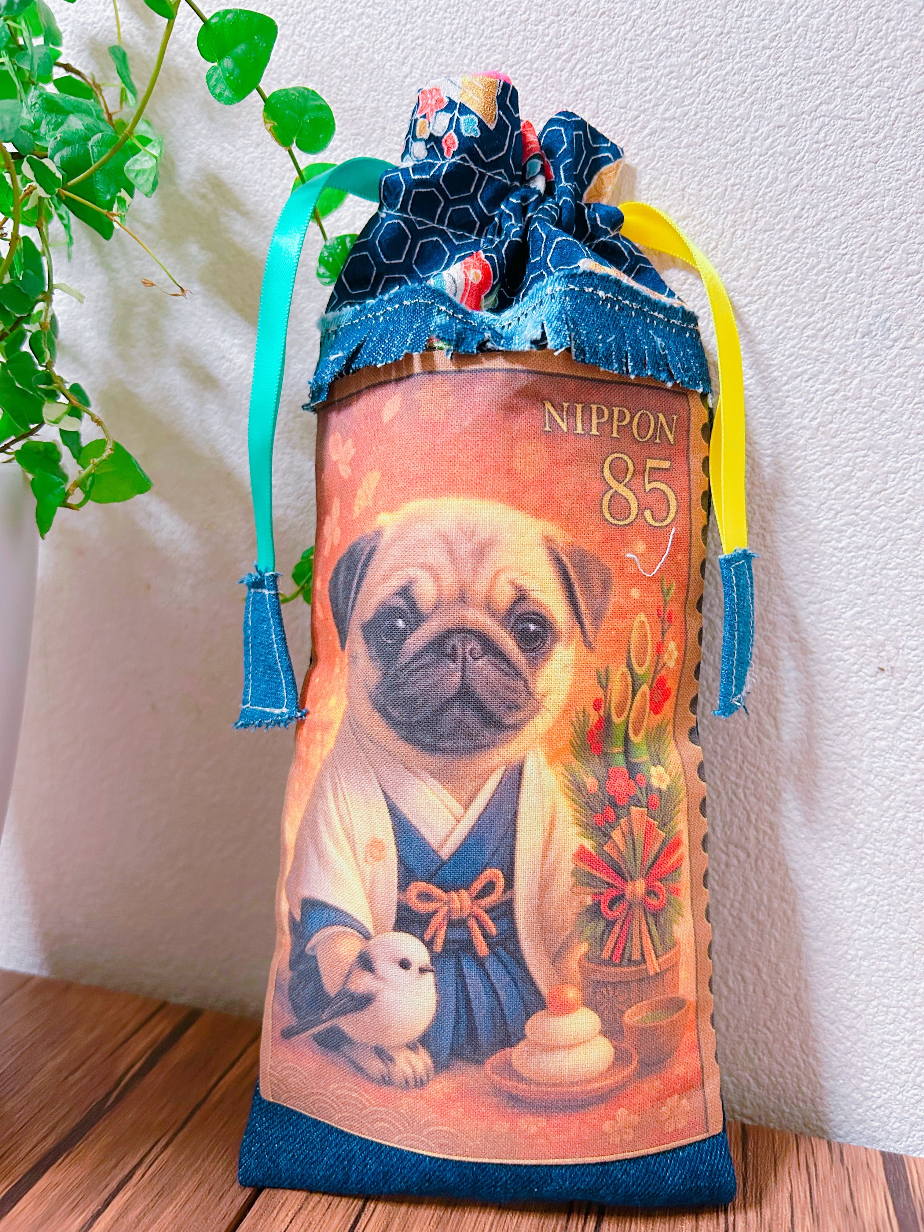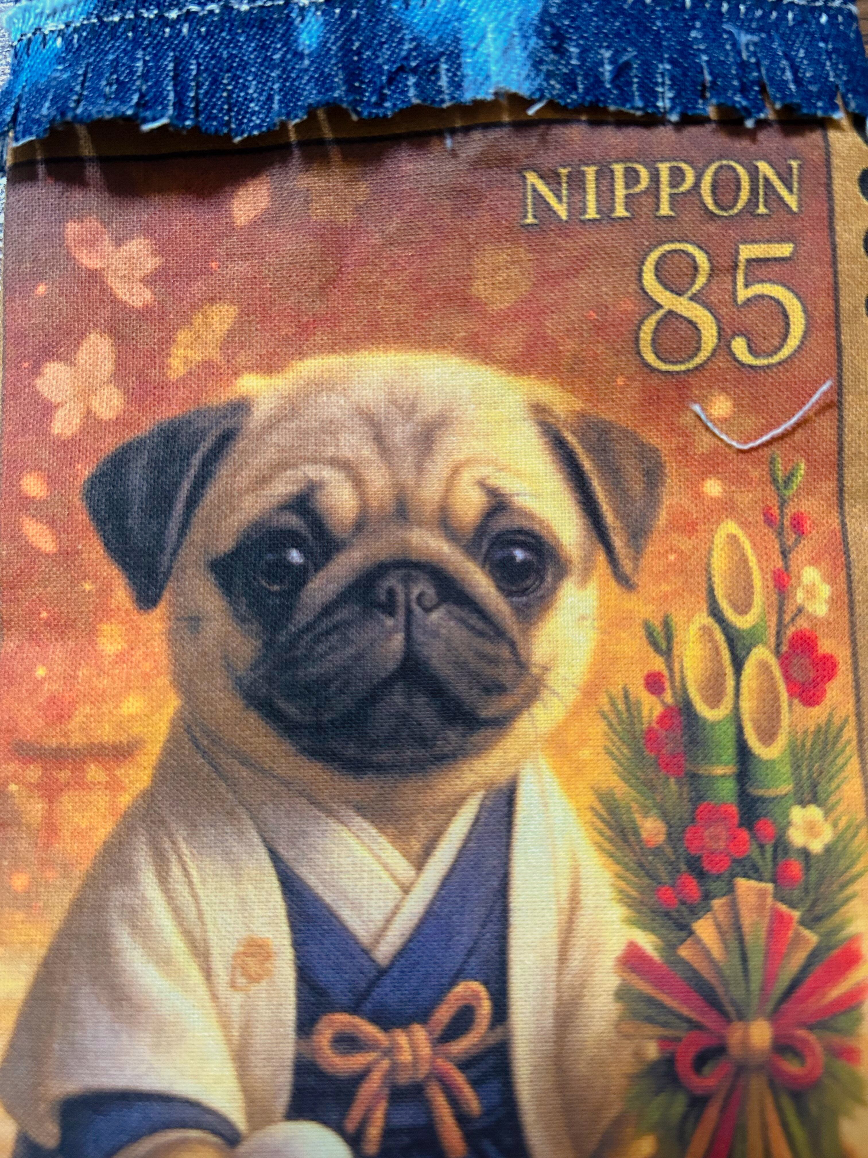 リメイクデニム巾着ポーチ★和柄Sサイズ★パグ