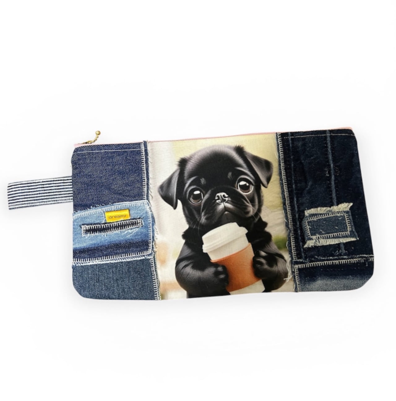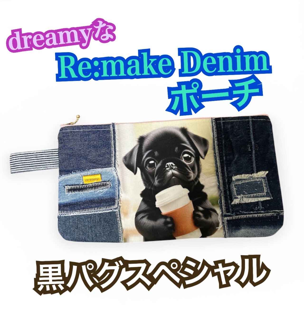 リメイクデニムBIGポーチ★30×16★黒パグスペシャル